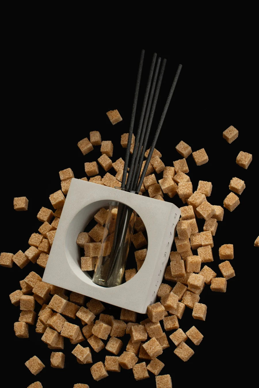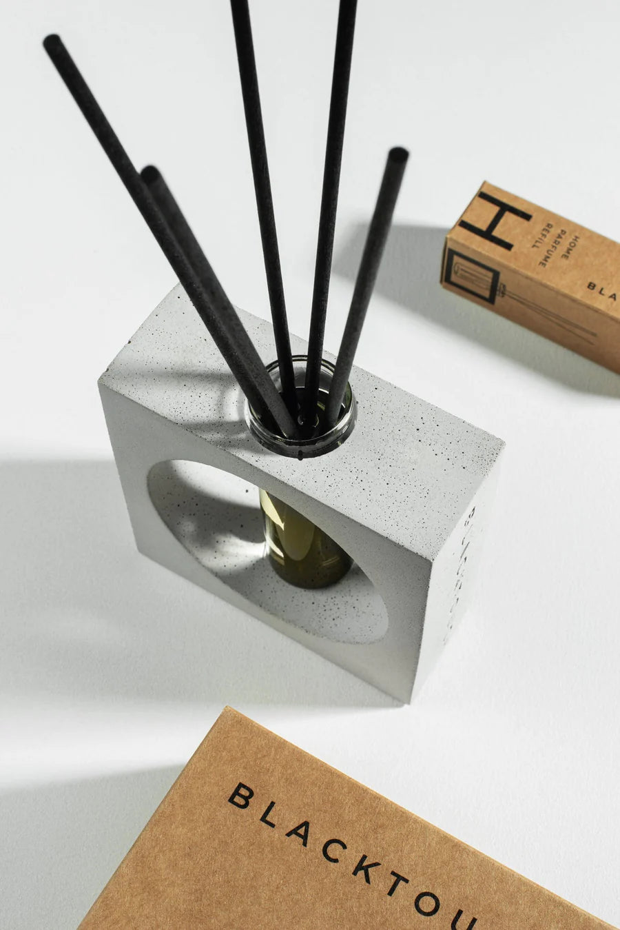Попри внутрішню насиченість, цей аромадифузор звільняє тебе від будь-якого візуального шуму. Мінімалістично витончений, зі скла та бетону, він може як мімікрувати на фоні кімнати, так й приваблювати погляд. Але завжди залишається її окрасою.