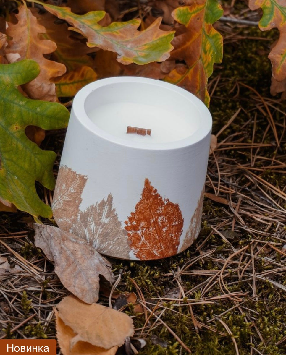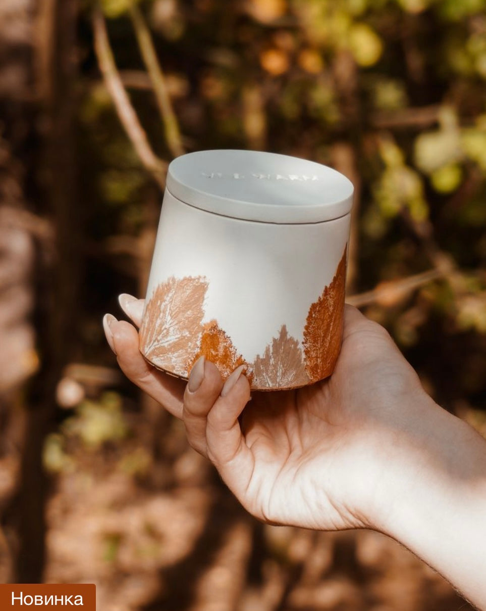 Золоті барви поєднались із текстурами хрусткого опалого листя, щоб нагадати нам про улюблену пору. Тонкі візерунки на горщику нагадують гербарій, який ми всі колись збирали в дитинстві, йдучи прохолодним ранком до школи. Ця свічка — наша тепла згадка про ті миті, що дарує затишок і відчуття ностальгії.